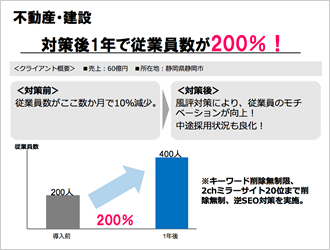 ユーザーは検索エンジンから御社のサイトに訪れます。 その検索エンジンに表示されるネガティブなワードは御社の経営に多大な被害を与えています。