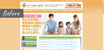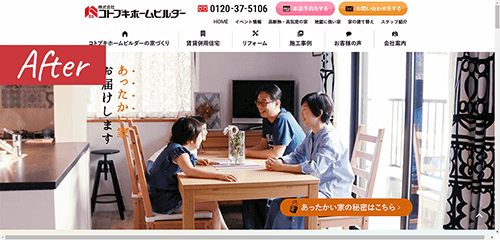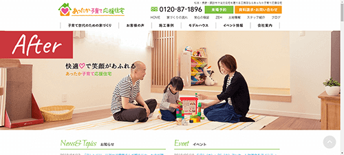 あったか子育て応援住宅という社名から伝わる優しいイメージが伝わるように写真やコピー、デザインを変更いたしました。会社の魅力が伝わるホームページができあがり、「女性が見ても共感できるサイトですね。」とのお言葉を頂きました。また、ホームページからモデルハウスの来場予約やお問合せが一気に増えるという結果を出しています。