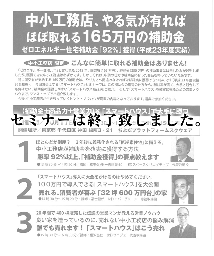 1)勝率92%以上、「補助金獲得」の要点教えます。 2)売れる、消費者が喜ぶ「32坪600万円台」の家。 3)誰でも売れます!「スマートハウス」はこう売れ。