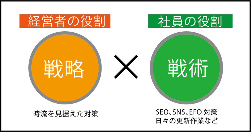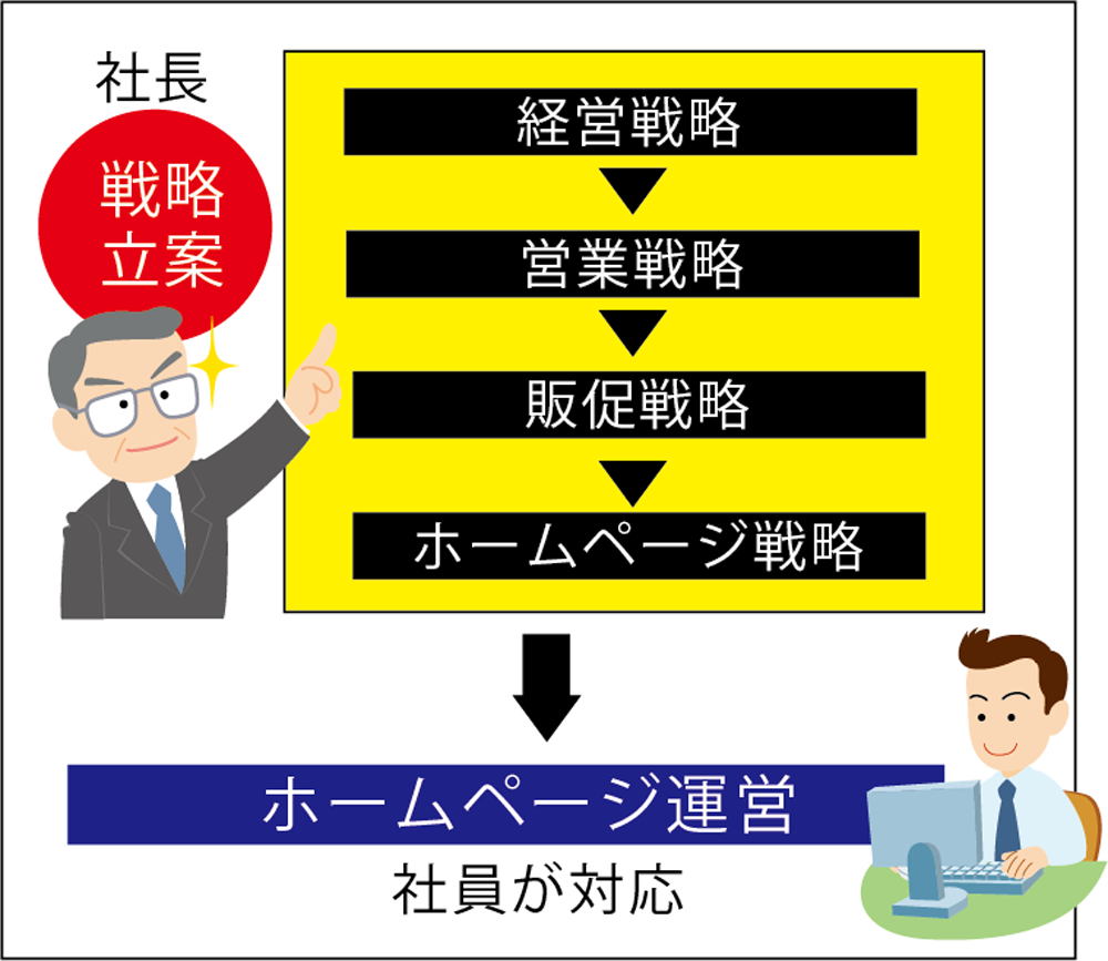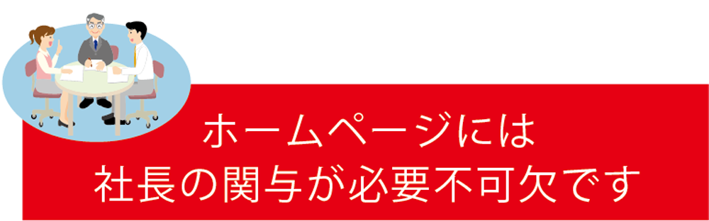 ホームページのSEO対策やブログ、FBの更新などは社員さん、ホームページ担当者に任せても大丈夫です。ただし、実際にホームページで受注する為の戦略の立案には社長の関与が絶対に必要となります。何故ならば、ホームページは単体で存在するのでなく全体の営業戦略の中で位置づけないと無意味だからです。