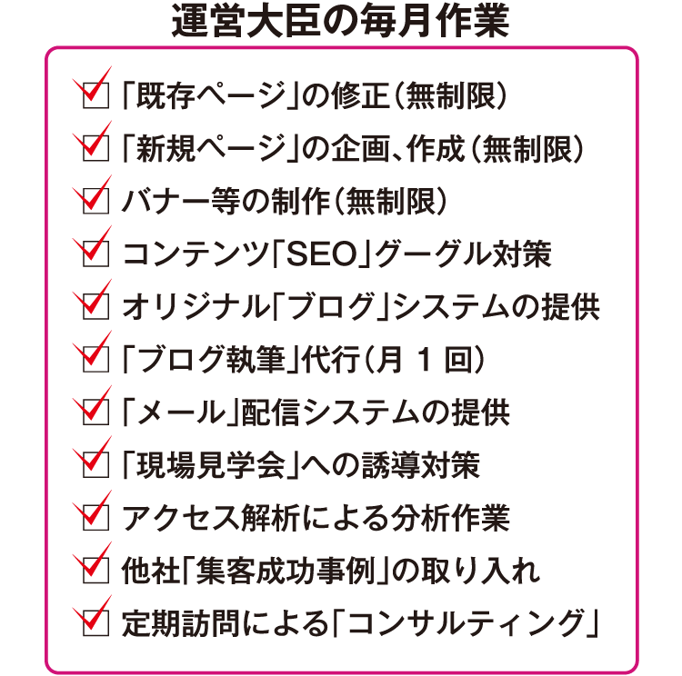 当社のホームページ「運営大臣」は単なるホームページの運営代行ではありません。「住宅会社」専門のチタンだから出来る「住宅会社」の悩みを全て解決するために、ホームページの運営に関わること全てを当社が行い、売れるホームページへと変身させる作業のことです。本当になやまれてる社長様に喜んでいただくために開発したサービスです。