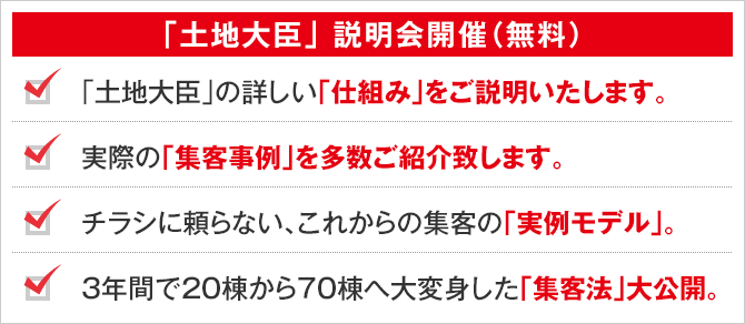 今回、全国各地で「土地大臣」の説明会を開催することにしました。というのも「土地大臣」の集客方法がITとWEBを活用した方法であるため、50代以上の経営者の場合、お電話では内容を説明しきれないと判ったからです(そのため電話で仕組み等をご説明致するのを一切やめました)。