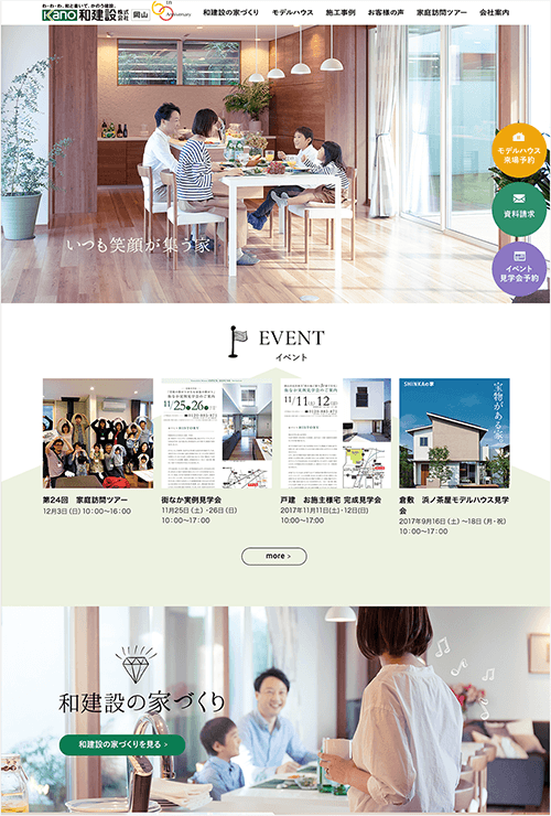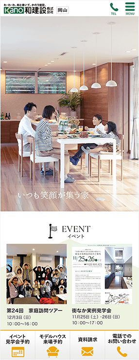 和建設様のホームページのリニューアルに関しましては、スマートフォンでの見せ方にこだわって制作いたしました。お客様の声や施工事例など和建設様が今まで培ってきた魅力を観る人にわかりやすく伝わるように仕上げました。さらにモデルハウスやイベントに来場してもらうための動機付けやメリットをしっかりと打ち出したことが今までのホームぺージとの大きな違いとなっています。