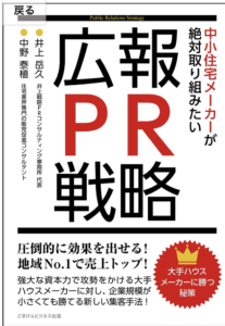 このたび、横浜カレーミュージアムの元館長、現カレー大学の理事長である井上岳久氏とコラボして、住宅会社が絶対に取り込むべき「広報PR戦略」をアマゾンより出版いたしました。 年々集客費用が高騰している「住宅業界」への一つの解決方法となればとの思いから企画しました。私が考える「PR戦略」の良いところは、一度やり方さへ覚えれば、その後は「集客費用0円」で半永続的に集客できてしまうことです。また「PR戦略」というとブログを書いたりSNSを発信したりすることと考えている方が多いようですが、これは全くの誤りです。その一番の違いとは、「PR戦略」はまったく自社を知らない見込み客に対して、大手メディアを巻き込み集客とブランディングを同時に出来てしまうことです。SNSはすくなくとも、最初に自社を知っていて、好意をもっていてもらわなければいけませんが、「広報PR」戦略は、その必要はありません。今回は、具体的なPRの書き方から、媒体へのアプローチ方法などの具体的手法を全て記載しましたので、「集客」にお悩みの工務店、不動産会社、リフォーム会社様は是非とも一読することをお勧めいたします。