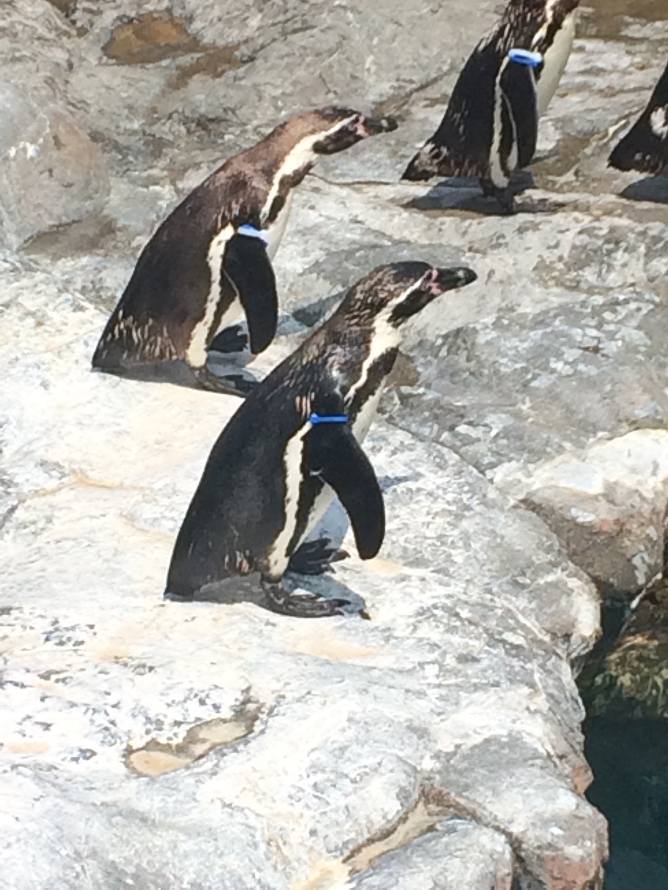ペンギンを見ていると癒されますね。ちょうど食事の時間だったので、誰もプールに入らずに飼育員の周りに集まっていました。