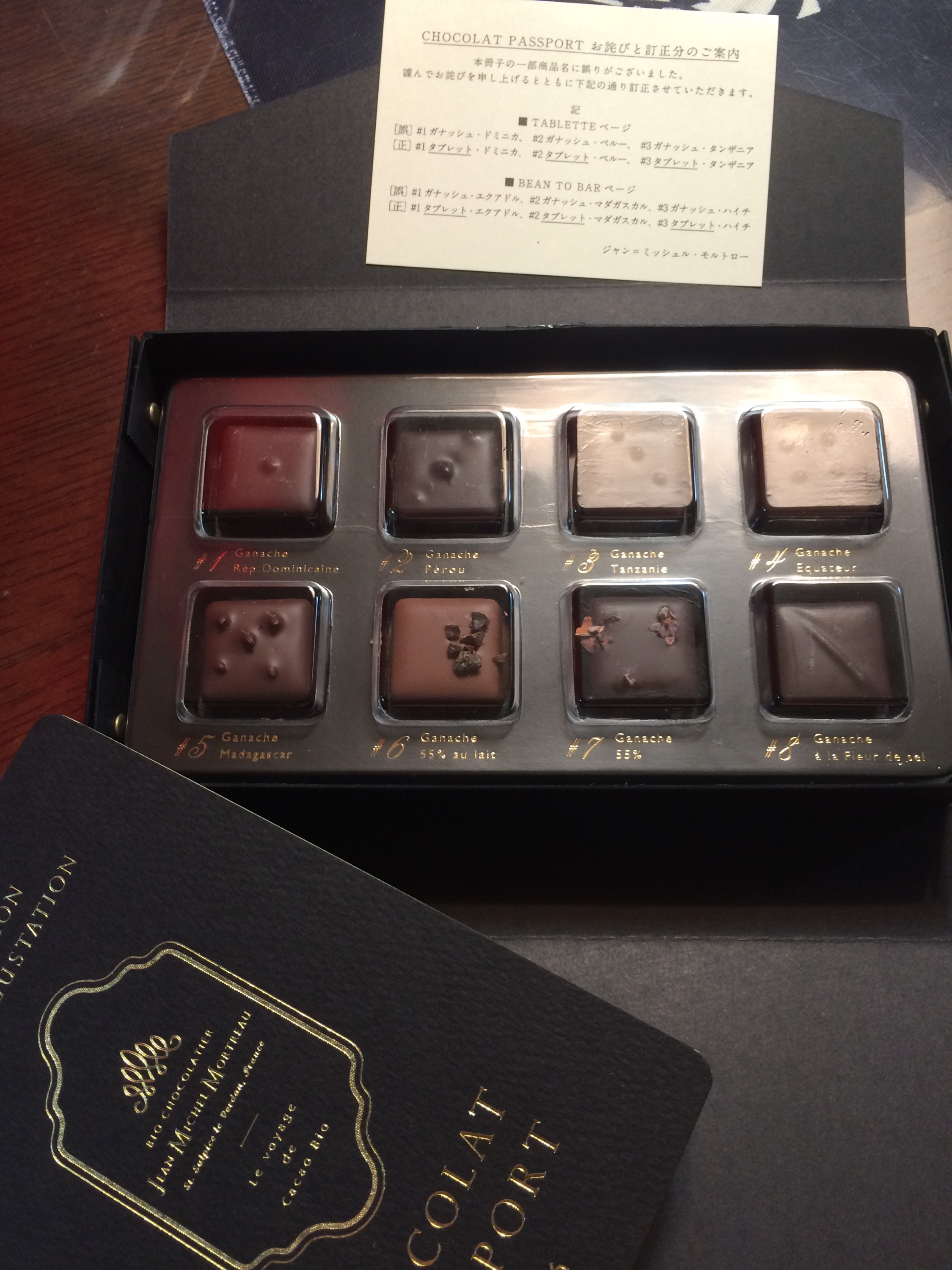 材料は同じで、産地の違うカカオが5種類、カカオ配合率の違うチョコが3個の計8個のチョコとパンフレットが入っています。