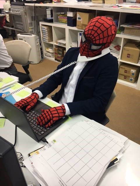 編集部の唯一の男の子!篠崎がハロウィンのためにわざわざネットでスパイダーマンのユニフォームを買って出勤してきました(笑)