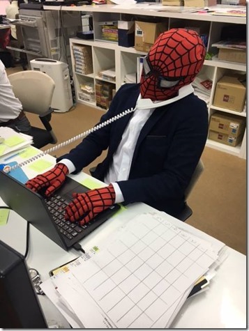 編集部の唯一の男の子!篠崎がハロウィンのためにわざわざネットでスパイダーマンのユニフォームを買って出勤してきました(笑)