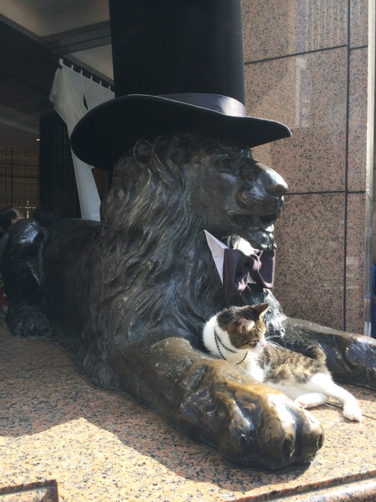 これは三越のライオン像とツーショットです。誰かの飼い猫のようですが、とても大人しい子でした。