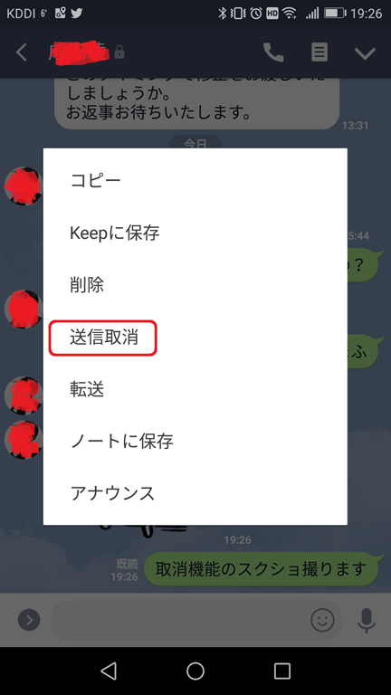 使い方は、削除と同じく取り消したいメッセージを長押しして、出たメニューから送信取消ボタンを押すだけです。