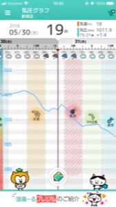 折れ線グラフで毎日の気圧を教えてくれます。アプリ内のキャラクターたちもかわいいです。