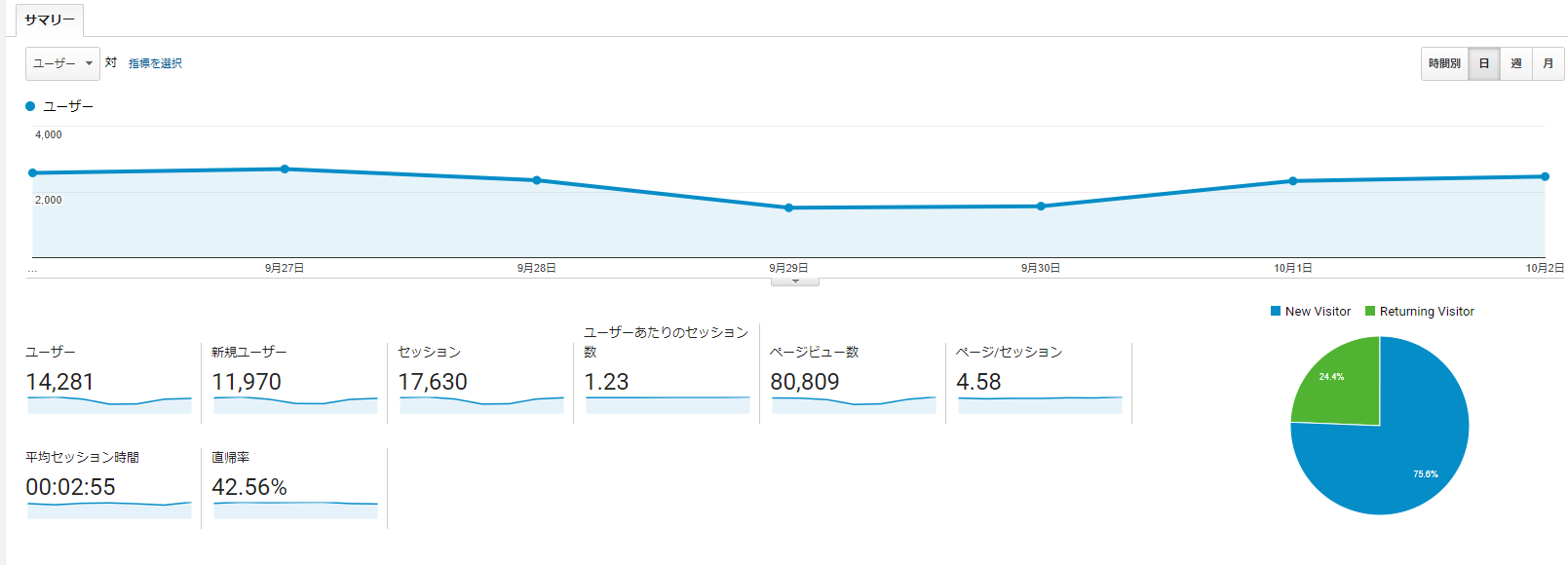 アクセスしたユーザー数、セッション数、ページビュー数、直帰率など数値が並んでいますね。