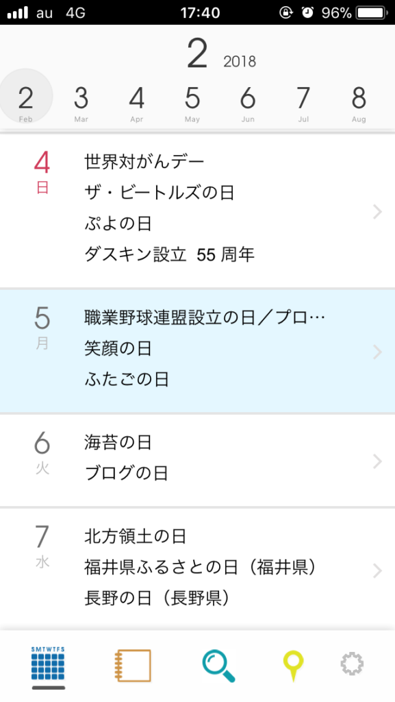 こんな感じでその日のできごとや、記念日が表示されます。