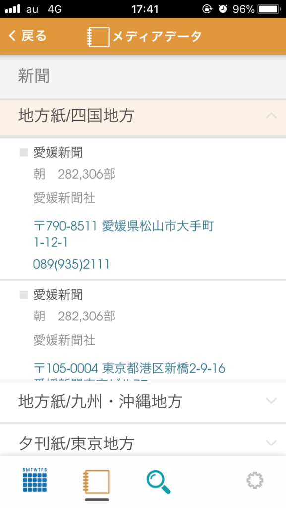 メディアデータタブをタップすると、新聞社、通信社、テレビ局の一覧が!