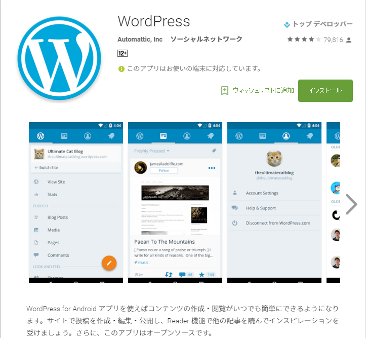 そして最後はいつでもどこでもブログ更新。そんなための必須ツールがWordPressのアプリです。こちらはブログがWordPressであることが前提ではあるものの、どこでも思いついたときに記事の投稿・下書きなどに使用できるのが頼もしい。スマホで記事の概要や下書きを書いて、アイデアをまとめておいて後でPCから編集投稿するということができれば、ブログの更新頻度も上げられる!バージョンアップも頻繁に行われているので機能改善も進んでいてこれからさらに便利になるのではないかと期待できるアプリです。