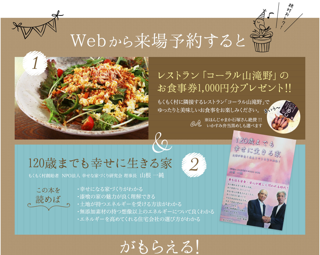 webから来場予約すると隣接する「レストラン山滝野」のお食事券と「120歳までも幸せに生きる家」の本をプレゼントしてもらえます。
